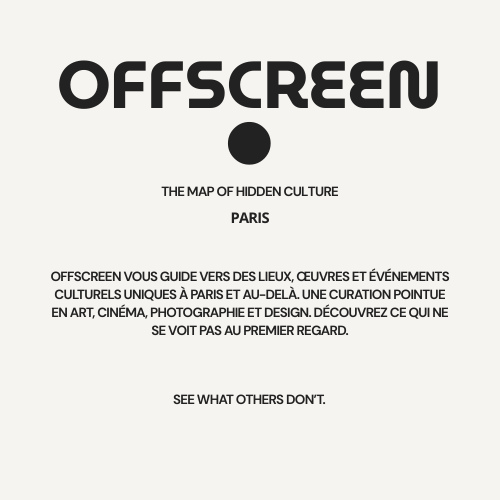 Offscreen guides you to unique cultural spots, artworks, and events in Paris and beyond. A curated selection of art, cinema, photography, and design—discover what’s hidden in plain sight.